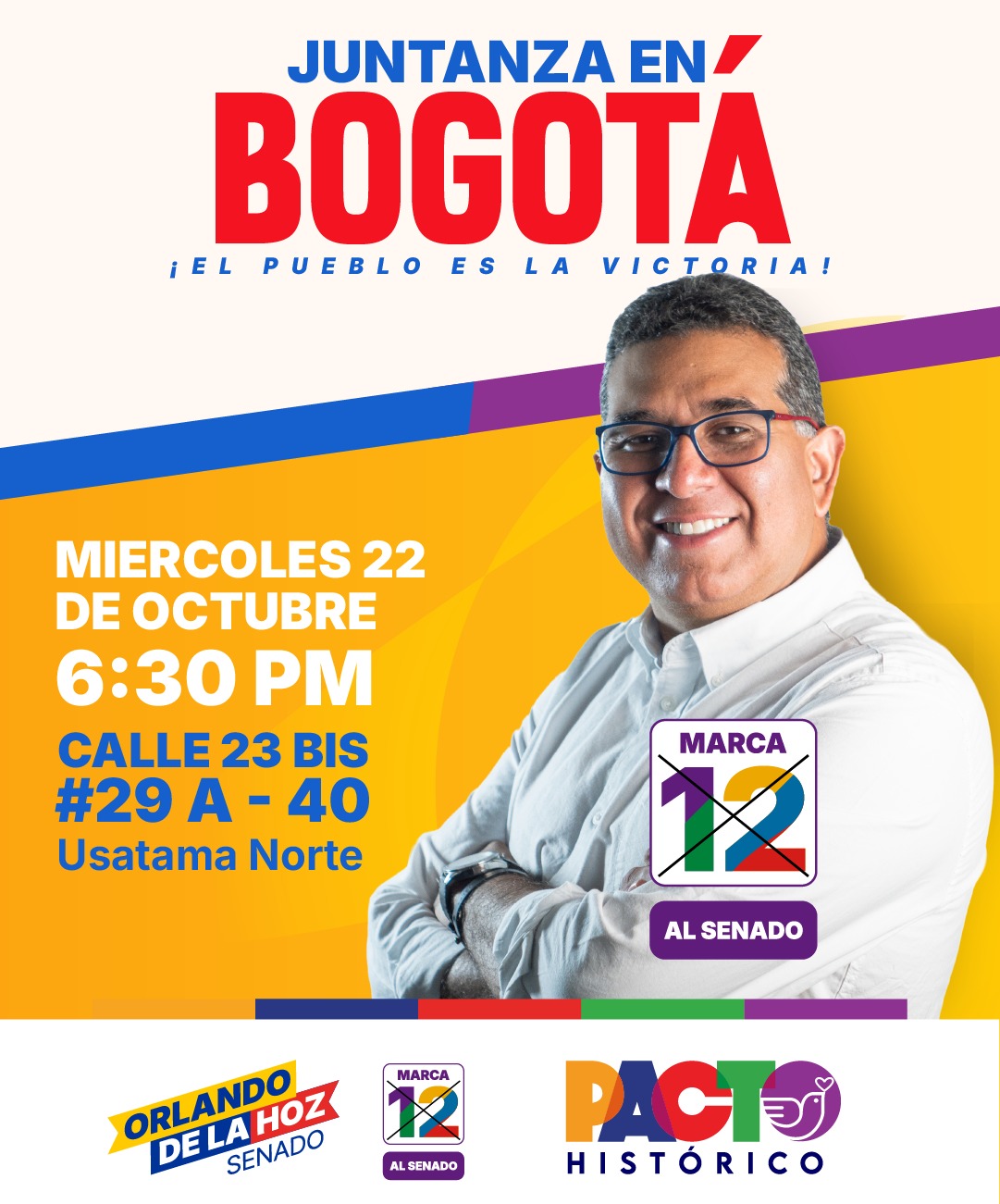 El precandidato al senado de la República #12 en el tarjetón de la consulta popular por el Pacto Histórico, Orlando De La Hoz, hará su cierre su campaña en la capital del País este miércoles 22 de octubre en la calle 23 BIS No 29ª-40 Usatama Norte a las 6:30 de la tarde, donde dará a conocer su propuesta política, especialmente para Bogotá, frente a los desafíos políticos, ambientales y económicos que tiene la ciudad.