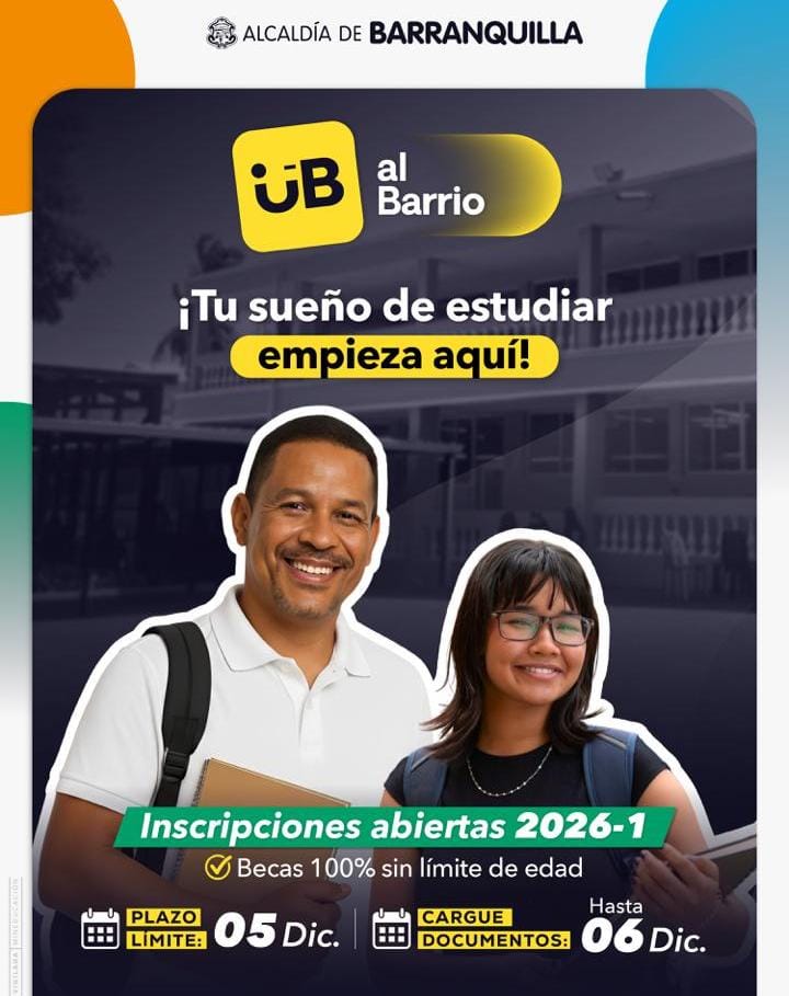 La Alcaldía Distrital de Barranquilla, en alianza con la Institución Universitaria de Barranquilla (IUB), anuncia la apertura de la tercera convocatoria de IUB al Barrio 2026-1, que ofrece a los jóvenes barranquilleros la oportunidad de acceder a 1000 cupos y prepararse profesionalmente de manera gratuita en 5 localidades de la ciudad en colegios oficiales del Distrito.