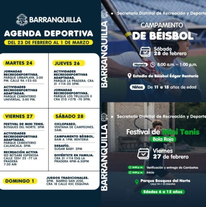 Con el firme propósito de consolidar a Barranquilla como una capital deportiva de talla mundial, el alcalde Alejandro Char continúa fortaleciendo la oferta recreativa de la Alcaldía Distrital con una agenda robusta, coordinada por la Secretaría de Deportes, que inició el martes 24 y se extiende hasta el domingo 1 de marzo.